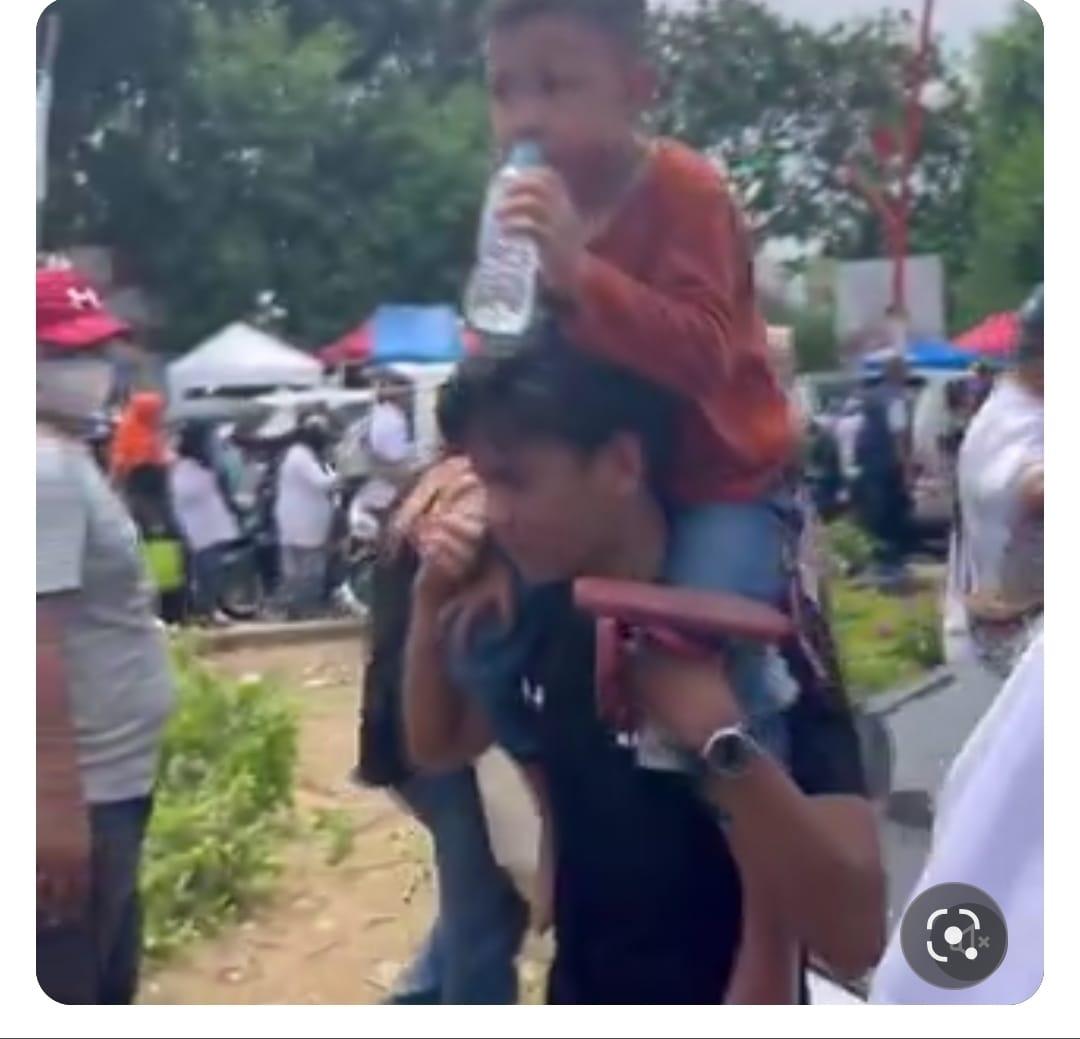 Seperti dilihat pada rekaman video yang merekam dirinya ketika menggendong di bahunya seorang anak kecil yang terlihat menangis.