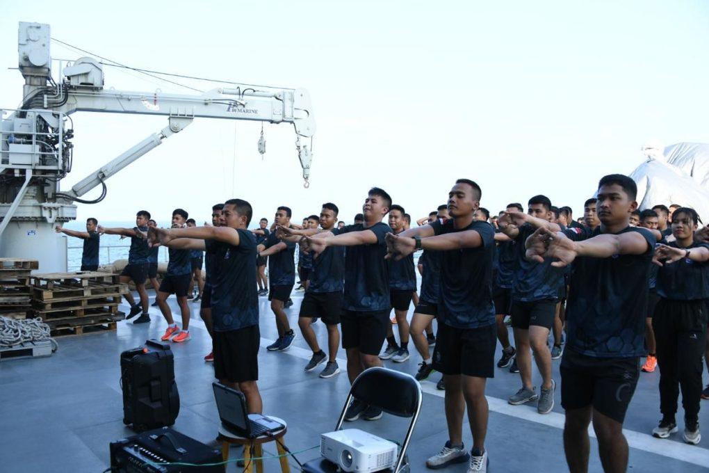 Kencangnya angin dan ombak laut tidak menjadi penghalang bagi prajurit dalam melaksanakan olahraga pagi yang diikuti oleh seluruh personel Satgas. Kegiatan diawali dengan pemanasan lalu dilanjutkan dengan lari mengitari heli Deck KRI RJW-992.