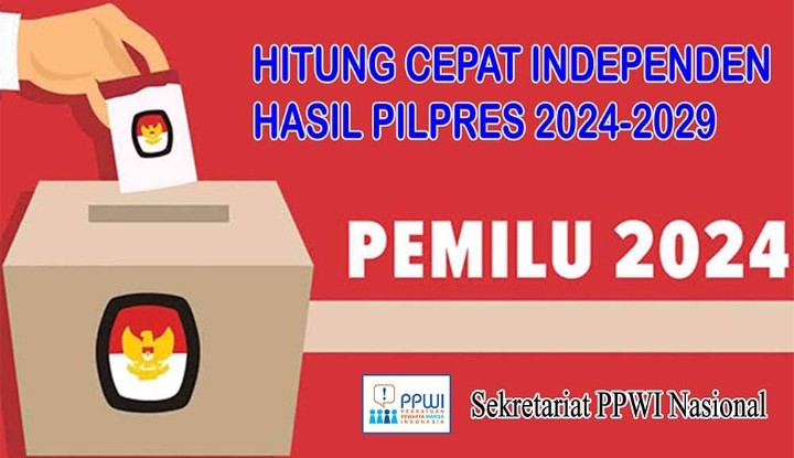 Hasil hitung cepat independen ini hanya untuk kepentingan dan referensi di internal organisasi PPWI. Untuk keperluan komunikasi di internal PPWI, silahkan gabung ke group khusus PPWI – Hitung Cepat Pilpres 2024 (https://chat.whatsapp.com/CBhLl5o4hl70FWxuuXpAFD). Terima kasih dan sukses untuk Pemilu Indonesia 2024.