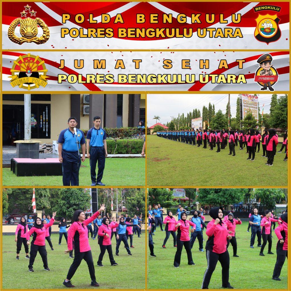 Bengkulu Utara, Personel Polres Bengkulu Utara melaksanakan kegiatan Jumat Sehat dengan cara melakukan olahraga senam bersama Bhayangkari Cabang Bengkulu Utara di Halaman Apel Mapolres Bengkulu Utara pada Jumat (23/02/2024) pagi.