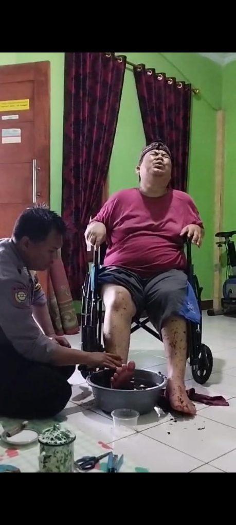 Tidak ragu, Bripka Yophi Prima membantu dengan membasuh kaki dari Ujang saat menjalani terapi kakinyaBripka Yophi Prima membantu dengan membasuh kaki dari Ujang saat menjalani terapi kakinya itu.