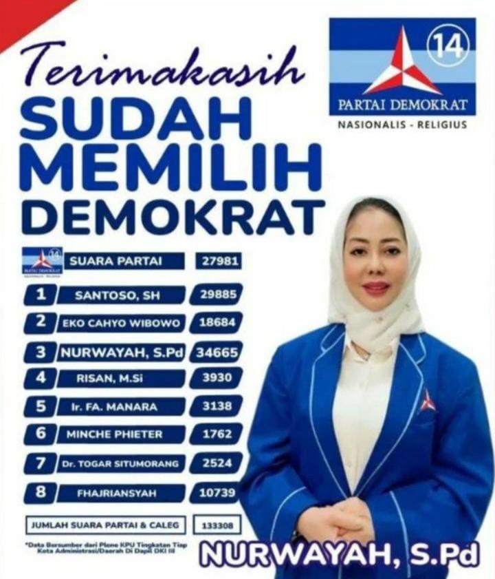 Grace Natalie PSI, berdasarkan rilis terakhir dan realcount KPU tidak lolos ambang batas Parlement Treshold 4%. Keberhasilan Nurwayah newcomer Dapil 3, meraih 1 kursi di Dapil neraka. Menggeser Incumbent, menjungkalkan prediksi banyak orang. Vini, Vidi, Vici. Datang, berkompetisi dan menang. Putri Nelayan memperoleh 34665 Suara, tertinggi di internal delapan Caleg Demokrat.