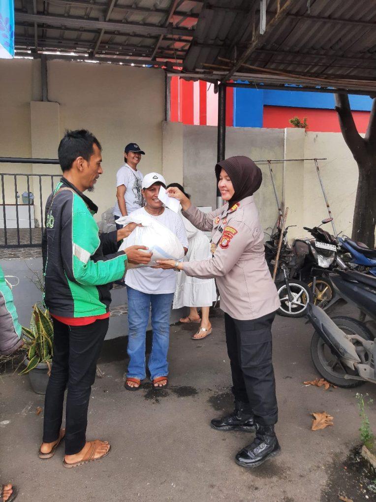 Kapolsek Medan Satria Kompol Nur Aqsa Ferdianto SE diwakili Wakapolsek Kompol Sukarno bersama Kanit Binmas AKP Sudarmi, Panit Binmas Ipda Kurniato dan Bhabinkamtibmas Aiptu Slamet dan Aipda Iko secara humanis membagikan paket sembako kepada warga dan pengemudi ojol.