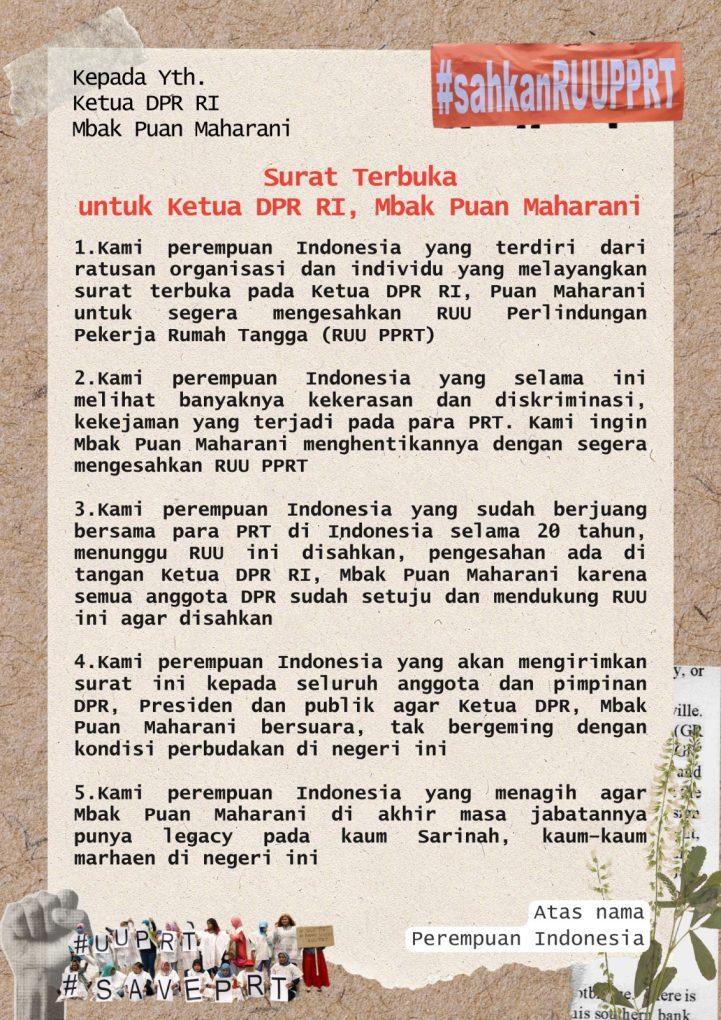 1.Kami perempuan Indonesia yang terdiri dari ratusan organisasi dan individu yang melayangkan surat terbuka pada Ketua DPR RI, Puan Maharani untuk segera mengesahkan RUU Perlindungan Pekerja Rumah Tangga (RUU PPRT)