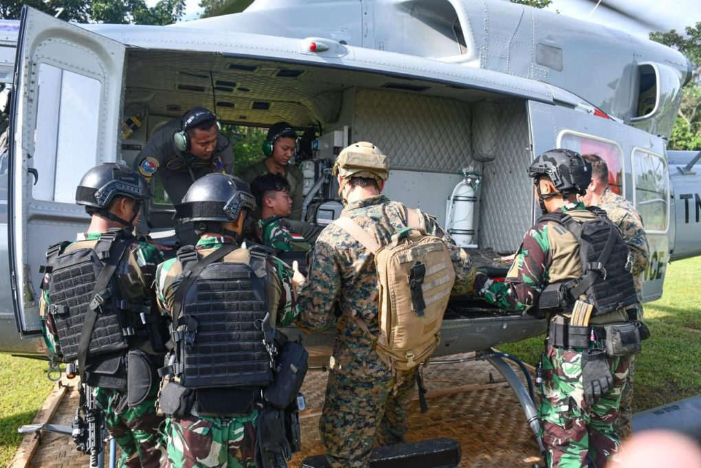 Jakarta, 27 April 2024 — TNI Angkatan Laut (TNI AL) dalam hal ini Prajurit Batalyon Intai Amfibi (Taifib) Korps Marinir bersama USMC 1st Reconnaissance Battalion yang tergabung dalam Latihan Bersama (Latma) Reconnaissance Exchange (RECONEX) 2024 antara TNI Angkatan Laut (AL)/Korps Marinir (Kormar) dengan United States (US) Marine Forces Pacific (MARFORPAC) First Marine Expeditionary Force (I MEF) melaksanakan Latihan Evakuasi Medis Udara menggunakan Pesawat Helikopter Bell 412 SP, Skuadron Udara 400 Wing Udara 2 di lapangan Pusat Latihan dan Pertempuran Marinir 6 Antralina (Puslatpurmar 6 Antralina) Jampang Tengah, Kabupaten Sukabumi, Sabtu (27/04). Pada latihan ini disimulasikan adanya personel yang menjadi korban luka tembak, kemudian korban dievakuasi melalui darat menggunakan ambulance untuk diberikan pertolongan pertama, setelah dilakukan pertolongan pertama dan pemeriksaan, dokter memutuskan agar korban segera dirujuk ke Rumah Sakit agar mendapatkan pertolongan lanjutan melalui jalur udara. Sehingga korban akhirnya dievakuasi menggunakan Pesawat Helikopter Bell 412 SP, Skuadron Udara 400 Wing Udara 2. Komandan Batalyon Intai Amfibi 1 Marinir (Danyontaifib 1 Mar) Mayor Marinir Laili Nugroho, M.Tr.Opsla., menyampaikan bahwa latihan evakuasi medis udara tersebut bertujuan untuk melatih kerjasama antaraย prajurit Taifib dan USMC 1st Reconnaissance Battalion dalam menangani prajurit yang terluka pada saat melaksanakan latihan serta memberikan gambaran mekanisme kerja danย Standard Operational Procedure (SOP)ย dalam setiap aktifitas maupun kejadian yang dialami personel di daerah penugasan. Keterlibatan TNI AL pada Latma RECONEX 2024 ini merupakan implementasi dari kebijakan Kepala Staf Angkatan Laut (Kasal) Laksamana TNI Dr. Muhammad Ali dalam meningkatkan peran diplomasi TNI AL dengan negara sahabat serta meningkatkan kemampuan prajurit Jalasena pada bidangnya masing-masing guna menghadapi tantangan ke depan yang semakin kompleks. Demikian berita Dinas Penerangan Angkatan Laut.