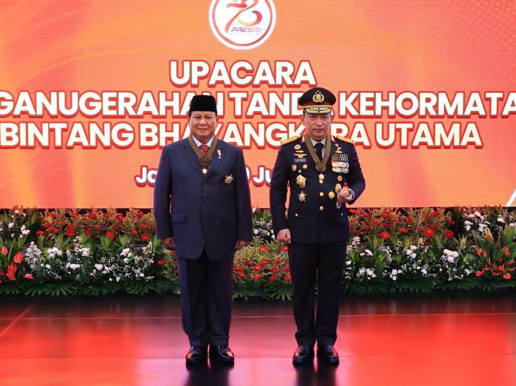 REPORTASE JAKARTAJAKARTA — Menteri Pertahanan RI sekaligus presiden terpilih Prabowo Subianto menerima tanda kehormatan Bintang Bhayangkara Utama dari Polri. Penyematan tanda kehormatan itu dilaksanakan di Rupattama Markas Besar (Mabes) Polri, Jakarta Selatan, pada Kamis (20/6/2024) siang.
