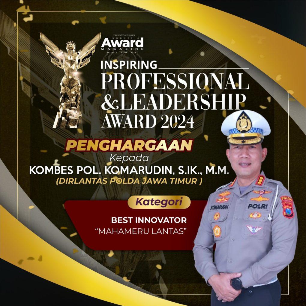 SURABAYA, – Dirlantas Polda Jatim Kombes Pol Komarudin, S.I.K., M.M. meraih penghargaan bergengsi level Asia sebagai “Best Innovator”. Prestasi ini merupakan kebanggaan bagi jajaran Polri berkat sepak terjang dan inovasi brilian berbasis manfaat. Kombes Pol Komarudin telah mendesain sebuah program besar Mahameru Lantas.