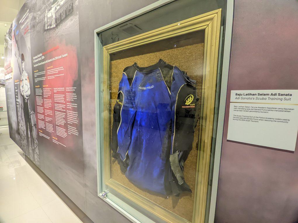 “Saat terjadi gelombang Tsunami, Ipda Adi Sanata dihantam oleh gelombang dan masih sempat membantu menaikkan anak-anak ke atas perahu serta mengulurkan tali kepada warga yang hanyut, ia menempatkan batangan kayu besar yang hanyut untuk dijadikan pelampung bagi warga di tengah gelombang air,” jelas catatan di Museum Akpol.