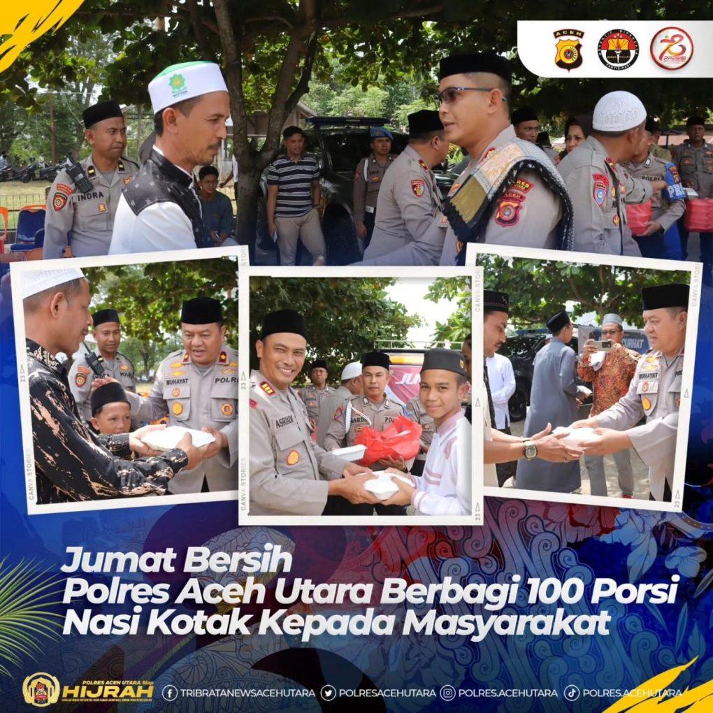 REPORTASE JAKARTALHOKSUKON – Polres Aceh Utara, dipimpin oleh Kapolres AKBP Nanang Indra Bakti, S.H., S.I.K., melaksanakan kegiatan Jumat Bersih (Berbagi Kasih) dengan membagikan 100 porsi nasi kotak kepada masyarakat usai pelaksanaan ibadah shalat Jumat di Masjid Baitul Mustaqim, Gampong Alue Bilie Rayeuk, Kecamatan Baktiya, Aceh Utara, Jumat (2/8/2024).