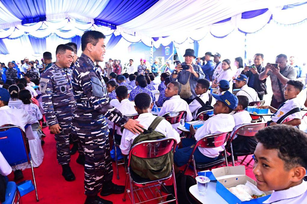 Jakarta, 7 Agustus 2024,—- Sebagai bentuk kepedulian kepada masyarakat di wilayah timur Indonesia, TNI AL menggelar kegiatan Bakti Sosial dan Kesehatan yang dihadiri langsung oleh Kepala Staf Angkatan Laut (Kasal) Laksamana TNI Dr. Muhammad Ali didampingi Ketua Umum Jalasenastri Ny. Fera Muhammad Ali di Distrik Kota Waisai, Kabupaten Raja Ampat, Rabu (07/08). Kedatangan rombongan di Distrik Kota Wasai disambut langsung oleh Bupati Raja Ampat Abdul Faris Umlati S.E. dan Forkopimda setempat. Kasal dan rombongan selanjutnya disambut oleh Tarian adat Papua sebelum melaksanakan peninjauan ke lokasi Bakti Sosial dan Kesehatan TNI AL di Pantai Waisai Torang Cinta (WTC). Setibanya di lokasi kegiatan, Kasal berkesempatan meninjau langsung pelaksanaan kegiatan Bakti Kesehatan yang memberikan pelayanan pengobatan gratis bagi masyarakat dengan target sebanyak 200 orang masyarakat dan kegiatan Bakti Sosial pembagian 400 paket sembako sebagai bentuk kepedulian TNI AL terhadap warga sekitar. Tidak hanya itu, TNI AL dalam hal ini Lantamal XIV Sorong juga memberikan kegiatan penyuluhan kepada 100 nelayan setempat mengenai hukum laut yang bertujuan untuk memberikan pemahaman penting mengenai hukum maritim, bagaimana upaya menjaga kesehatan bagi para masyarakat nelayan dan pemahaman tentang bahaya judi online. Kasal menyampaikan bahwa kegiatan ini bertujuan untuk kesejahteraan masyarakat di wilayah Raja Ampat. “Keberhasilan kegiatan ini juga merupakan wujud dari sinergitas antara TNI AL dengan Pemda Ampat dan juga beberapa kedinasan seperti Dinas Kesehatan, Dinas Perikanan, Dinas Sosial, UMKM dan dinas lainnya untuk membantu mensejahterakan masyarakat di wilayah Raja Ampat ini”, jelas Kasal. Kasal dan rombongan juga meninjau stand UMKM kerajinan etnik Papua dan produksi makanan ringan yang menjadi binaan Primkopal Lantamal XIV Sorong. Kunjungan ini bertujuan untuk memberikan dukungan nyata terhadap perkembangan UMKM lokal dan sekaligus melihat hasil kerja para pelaku usaha di lapangan secara langsung. Usai peninjauan, Kasal didampingi Ketua Umum Jalasenastri serta rombongan menyempatkan untuk makan siang bersama yang bergizi “Gemar Makan Ikan” bersama dengan 1.000 pelajar dan masyarakat Papua. “Diharapkan kegiatan ini akan menjadi contoh untuk satuan-satuan TNI AL lainnya di seluruh Indonesia, dimana hampir seluruh Lantamal memiliki keramba ikan dan seperti yang kita ketahui sendiri bahwa ikan merupakan sumber gizi dan protein yang tinggi, sehingga ikan sangat cocok untuk para pelajar Indonesia untuk menjadi anak yang cerdas”, tegas Kasal. Kasal juga menyampaikan bahwa program makan bergizi bersama dengan pelajar serta masyarakat Papua ini sejalan dengan program yang dicanangkan oleh Presiden RI terpilih periode 2024-2029 Bapak Prabowo Subianto tentang pemberian makan sehat dan bergizi gratis kepada pelajar. Sembari menikmati hidangan dengan penuh keakraban, para undangan juga disuguhkan dengan dengan pertunjukan kemampuan dan ketangkasan prajurit TNI AL, mulai dari demonstrasi ketangkasan militer dari Satdik 3 Sorong dan panggung hiburan rakyat. (Red).