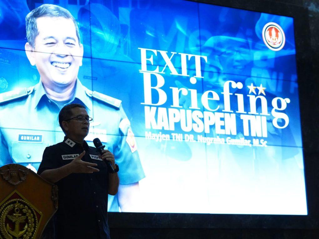 REPORTASE JAKARTA(Puspen TNI). Kepala Pusat Penerangan Tentara Nasional Indonesia (Kapuspen TNI) Mayjen TNI Dr. Nugraha Gumilar, M.Sc., melaksanakan exit briefing kepada seluruh personel Puspen TNI, bertempat di Aula Balai Wartawan Puspen TNI, Mabes TNI Cilangkap, Jakarta Timur, Kamis (8/8/2024).