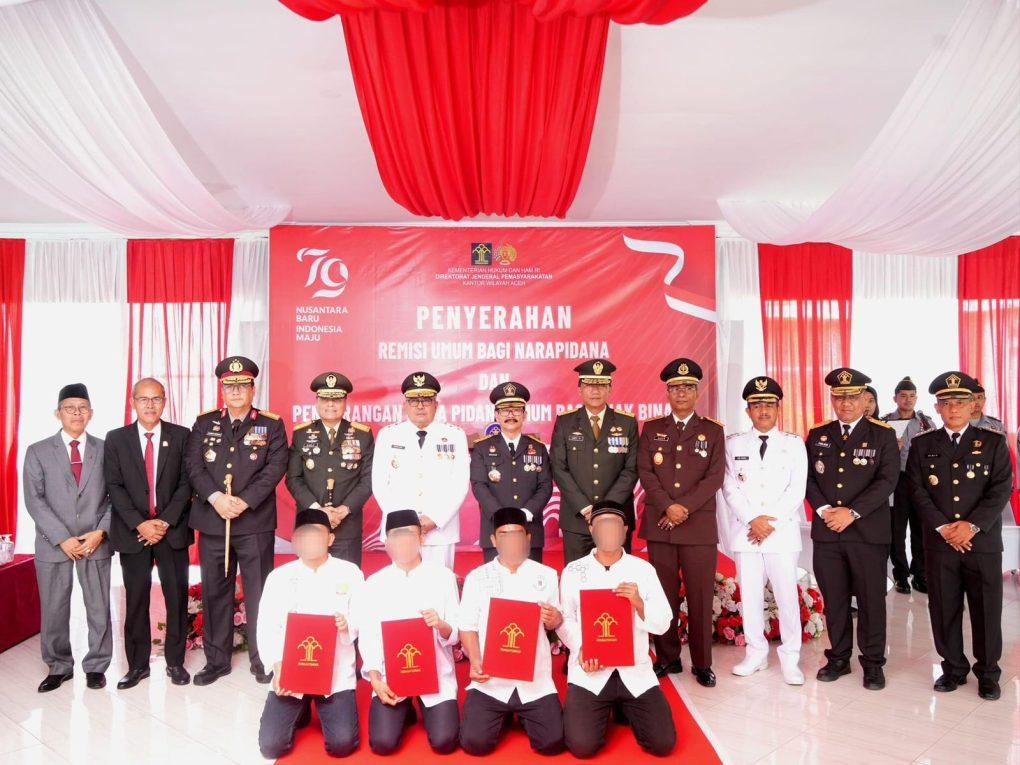 Penyerahan dokumen Remisi Umum dan Pengurangan Masa Pidana Umum kepada Warga Binaan Pemasyarakatan (WBP) dan anak binaan dilakukan secara simbolis oleh Pj. Gubernur yang didampingi Kakanwil Kemenkumham Aceh serta disaksikan oleh Jajaran Forkopimda Provinsi Aceh.