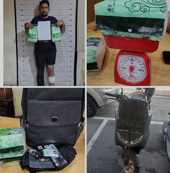 Adapun barang bukti yang dapat kami amankan 2 (dua) bungkus Teh Cina Chinesse Pin Wei warna Hijau Muda berisi Sabu dengan Berat Brutto 2000 Gram, 1 (satu) unit Handphone Android, 1 (satu) unit Handphone Nokia Hitam, 1(satu) Tas Samping Warna Hitam, 1(satu) Ransel Warna Abu, 1 (satu) Lembar KTP , 1 (satu) Buku Pemilik Kendaraan Bermotor, 1 (satu) unit sepeda motor Yamaha N-Max dengan No.Pol : BK 3545 AKH