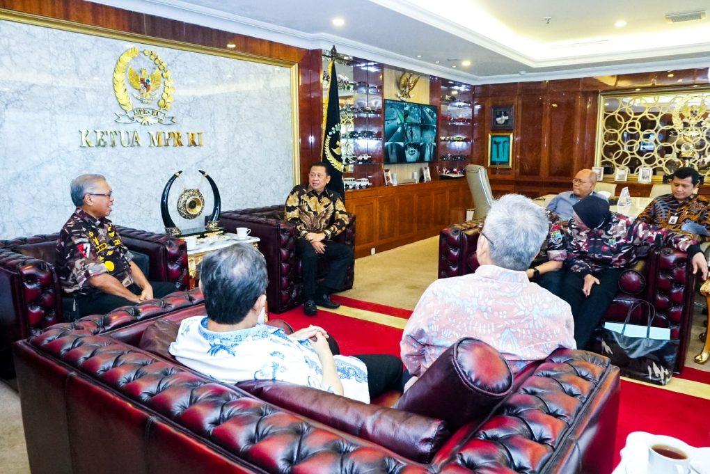 REPORTASE JAKARTAJAKARTA — Ketua MPR RI ke-16 Bambang Soesatyo menerima masukan dari Ketua Umum Forum Komunikasi Putra Putri Purnawirawan dan Putra Putri TNI Polri (FKPPI) Pontjo Sutowo mengenai perlunya MPR RI melakukan penyempurnaan terhadap UUD NRI Tahun 1945. Salah satu penyempurnaannya yakni sebagai lembaga perwakilan rakyat yang memiliki kewenangan tertinggi mengubah dan menetapkan konstitusi sebagai hukum dasar, MPR juga perlu diperkuat untuk merumuskan dan menetapkan Pokok-Pokok Haluan Negara (PPHN) sebagai Kebijakan Dasar.
