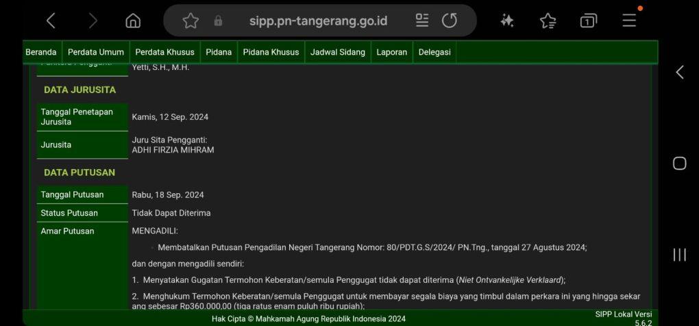 Melalui website Sipp.Tangerang.go.id.,Rabu 18 September 2024, dengan Amar Putusan: Membatalkan putusan pengadilan Negeri Tangerang dengan Nomor:80/PDT.G.S/2024/Pn.Tng, tanggal 27/08/2024 dan dengan Mengadili sendiri, mengatakan gugatan termohon keberatan/Semula penggugat tidak dapat diterima,,,menghukum termohon keberatan/Semula penggugat untuk membayar semua biaya yang timbul dalam perkara ini, sebesar 360.000,00 (tiga ratus enam puluh ribu rupiah).