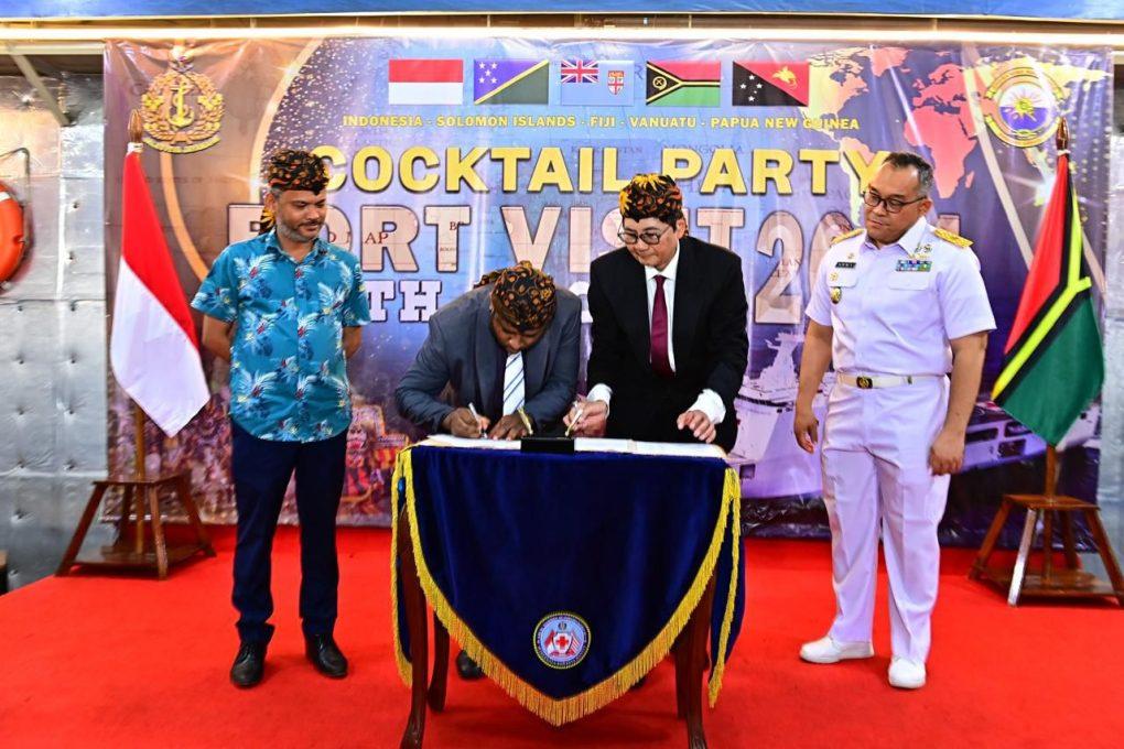 Jakarta, 9 November 2024 —– Satgas Port Visit 2024 menyelenggarakan National Reception yang dihadiri oleh Wakil Perdana Menteri Vanuatu Mr. Matai Seremaiah bertempat di Hanggar Heli KRI Wahidin Sudirohusodo-991 (KRI WSH-991) yang sandar di Port Vila, Negara Vanuatu. Sabtu (9/11). Wakil Perdana Menteri Vanuatu hadir bersama pejabat tinggi Vanuatu yaitu Menteri Kesehatan Vanuatu (Minister of Health) Hon. John Still Tariqetu, Menteri Pertanahan Vanuatu (Minister of Lands and Natural Resources) Hon. Rick Tchamako Mahe beserta para staf kementerian Vanuatu lainya. Sementara itu dari Indonesia pejabat yang hadir antara lain Duta Besar (Dubes) Indonesia untuk Australia merangkap Vanuatu Dr. Siswo Pramono, Askomlek Pangkoarmada RI Laksma TNI Ilham Army Ritonga, S.H., Dubes Cina H.E. Li Minggang, Dubes Jepang H.E. Mr. Okuda Naohisa, Komisi Tinggi Autralia H.E. Mrs. Nicolette Brent MBE, Athan Canberra Australia Laksma TNI Yusliandi Ginting, Atpol Canberra Australia Brigjen Pol Tommy Aria Dwianto, dan Politik Khusus Brigjen TNI Sunaryo serta para tamu undangan lainya. Kedatangan para tamu undangan diterima oleh Komandan Satgas Port Visit 2024 Kolonel Laut (P) Arif Prasetyo bersama Komandan KRI WSH-991 Kolonel Laut (P) Edi Herdiana, S.T., M.Tr.Opsla., di penjagaan KRI. Acara National Reception diawali dengan persembahan Tarian Saman. Kegiatan dilanjutkan persembahan lagu kebangsaan Indonesia dari para pelajar Papua Barat Daya yang tergabung dalam Satgas Port Visit dan dilanjutkan menyanyikan lagu kebangsaan Vanuatu, kemudian dilanjutkan dengan tradisi bersulang (toast). Wakil Perdana Menteri Vanuatu mengucapkan rasa terima kasih kepada pemerintah dan masyarakat penting Indonesia dalam memperkuat dan memajukan hubungan diplomatik “Kunjungan ini merupakan bukti nyata dari kemitraan timbal balik yang tumbuh dan bertahan lama sejak terjalinnya hubungan diplomatik formal pada tahun 1995 dan akan terus berlanjut,” ujarnya. Setelah itu dilaksanakan penandatanganan Berita Acara Serah Terima Bantuan Obat-obatan oleh Dubes RI kepada Wakil Perdana Menteri Vanuatu dan Menteri Kesehatan Vanuatu. Acara diakhiri dengan menikmati hidangan khas Indonesia dan penampilan kesenian Indonesia dari Personel KRI WSH-991, Satgas, dan Pelajar diantaranya Tarian Kreasi, Pencak Silat, Reog Ponorogo, dan Tarian Papua, dan foto bersama. Pada kesempatan terpisah, Kepala Staf Angkatan Laut (Kasal) Laksamana TNI Dr. Muhammad Ali menyampaikan kepada seluruh prajurit Jalasena yang tengah menjalankan misi muhibah diplomasi agar senantiasa menjaga hubungan kerjasama yang baik dengan negara sahabat, serta kehadiran TNI AL di negara kawasan Pasifik Selatan diharapkan dapat memberikan manfaat bagi masyarakat di sekitarnya. (Red).