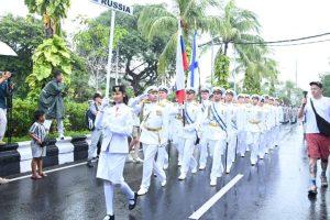 Jakarta, 18 Februari 2025 —– TNI AL berkomitmen dalam memperkenalkan budaya Indonesia kepada dunia, seperti dalam rangkaian 5th Multilateral Naval Exercise Komodo (MNEK) Tahun 2025, TNI AL menggelar City Parade yang dimulai dengan rute awal di Lapangan Makorem 163/WS dan berakhir di Lapangan Renon Denpasar, Bali. Selasa (18/2). Keberangkatan peserta dilepas langsung oleh Kepala Staf Angkatan Laut (Kasal) Laksamana TNI Dr. Muhammad Ali bersama Pj. Gubernur Bali Sang Made Mahendra Jaya. Kegiatan yang digelar bertujuan untuk meningkatkan sinergitas antara TNI AL dengan angkatan laut negara sahabat dalam bidang diplomasi dan stabilitas keamanan kawasan, serta memperkenalkan negara peserta MNEK 2025 kepada masyarakat Bali. Kirab kota tersebut berhasil memukau masyarakat Bali dengan penampilan parade Genderang Suling Gita Jala Taruna Akademi Angkatan Laut (AAL) yang menyuguhkan beberapa alunan musik dan atraksi drumband. Parade selanjutnya yaitu Kelompok Bendera Merah Putih, Kelompok Bendera Negara Partisipan, 13 negara partisipan, Drumband siswa/i SMA Bali, Personel TNI AD, Personel TNI AU, Personel Polri, Personel Bea Cukai, Personel KSOP, Personel Basarnas, Ogoh-ogoh, Gong bleganjur, Siswa/i berpakaian adat nasional dan Forum Maritim Bahari, serta tokoh-tokoh pewayangan. Adapun ke-13 kontingen negara partisipan yang terlibat dalam City Parade antara lain Australia, Filipina, France, Indonesia, India, Italy, Japan, Malaysia, Pakistan, Russia, Singapore, Thailand, dan Vietnam. Di saat acara yang sama, Kasal juga menyerahkan secara simbolis bantuan motor tempel listrik kepada perwakilan nelayan Desa Pengalon, Karangasem, Bali. (Red).