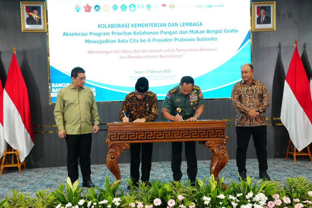 REPORTASE JAKARTA(Puspen TNI). Panglima TNI Jenderal TNI Agus Subiyanto menandatangani Memorandum of Understanding (MoU) TNI dengan Kementerian Desa dan Pembangunan Daerah Tertinggal dan juga dengan Badan Gizi Nasional, bertempat di Operational Room, Gedung Utama Lt.1 Kementerian Desa dan Pembangunan Desa Tertinggal Jl. TMP. Kalibata No.17, Pancoran, Jakarta Selatan, Senin (17/2/2025).