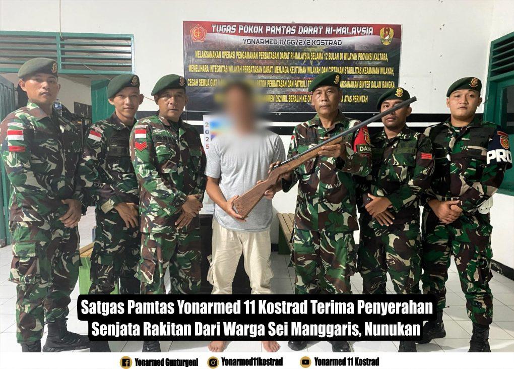REPORTASE JAKARTAJAKARTA — Nunukan, 3 Mei 2025 – Keberhasilan Satgas Pamtas Yonarmed 11 Kostrad dalam membangun kepercayaan dan kedekatan dengan masyarakat perbatasan kembali membuahkan hasil. Seorang warga dari Desa Sekaduyan Taka, Kecamatan Sei Manggaris, Kabupaten Nunukan, secara sukarela menyerahkan satu pucuk senjata api rakitan laras panjang jenis penabur kepada personel Pos Sei Ular.