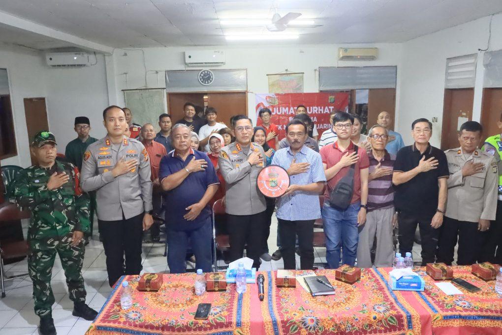 Kapolres Metro Jakarta Utara, Kombes Pol H. Ahmad Fuady, S.H., S.I.K., M.H., menghadiri kegiatan Ngopi Kamtibmas di Pos Satkamling RW 02 Kelurahan Pluit, Penjaringan, Jakarta Utara, Sabtu malam (24/5). Kegiatan ini menjadi ajang silaturahmi sekaligus forum komunikasi terbuka antara kepolisian dan masyarakat dalam upaya memperkuat keamanan lingkungan. Acara yang dimulai pukul 20.00 WIB ini diadakan di Kantor Sekretariat RW 02, Jl. Pluit Karang Barat Blok P.2 Selatan No.102. Turut hadir dalam kegiatan tersebut jajaran pejabat Polres Metro Jakarta Utara, Polsek Metro Penjaringan, unsur TNI, serta tokoh masyarakat dan pengurus lingkungan dari RT 01 hingga RT 09. Ketua RW 02, Bapak Bintang Hardiono, dalam sambutannya menyampaikan apresiasi atas kunjungan Kapolres Jakarta Utara ke wilayahnya. Ia menyampaikan bahwa meski fasilitas kantor RW belum sempurna, pihaknya terus berupaya memberikan pelayanan terbaik bagi warga. “Terima kasih atas kehadiran Bapak Kapolres. Kami merasa bangga dan tersanjung atas perhatian yang diberikan kepada warga RW 02,” ujar Bintang. Sementara itu, Kapolres Kombes Pol Ahmad Fuady menegaskan pentingnya menjaga keamanan dan ketertiban masyarakat (Kamtibmas) secara bersama-sama. Ia mengapresiasi peran aktif pengurus RW dan RT sebagai ujung tombak dalam mendeteksi serta menangani permasalahan sosial di lingkungan. “Keamanan bukan hanya tugas polisi, tetapi tanggung jawab bersama. Dari hal kecil di tingkat RT, kita harus tahu siapa warganya, dan membangun komunikasi yang terbuka,” ujarnya. Kapolres juga menyampaikan komitmen Polri dan TNI dalam memberantas aksi premanisme dan penertiban atribut ormas yang mengganggu ketertiban umum. Ia mendorong warga untuk tidak ragu melapor jika menemui praktik pungutan liar atau gangguan keamanan lainnya. Sesi tanya jawab berlangsung interaktif. Beberapa warga menyampaikan keluhan seperti adanya oknum yang mengatasnamakan RW untuk meminta uang kepada pelaku usaha, maraknya gerobak liar di sekitar masjid, hingga rawannya aksi pencurian kendaraan bermotor saat waktu salat. Kapolsek Metro Penjaringan, AKBP Agus Ady Wijaya, yang turut mendampingi, menegaskan bahwa pihaknya akan berkoordinasi dengan instansi terkait untuk menertibkan masalah gerobak liar. Ia juga menyarankan agar masyarakat meningkatkan pengawasan lingkungan secara mandiri dengan sistem ronda atau penjagaan bergiliran, terutama saat waktu ibadah. Permasalahan debt collector ilegal dan kemacetan lalu lintas di depan sekolah juga menjadi sorotan. Warga mengeluhkan oknum yang mengaku sebagai polisi dan tindakan debt collector yang meresahkan. “Kalau ada yang mengaku polisi, minta tunjukkan surat tugas dan identitasnya. Jika tidak jelas, segera lapor. Debt collector juga akan kita tindak tegas jika terbukti melanggar,” tegas Kapolres. Warga juga mengusulkan penambahan personel di Pospol Muara Karang karena keterbatasan jumlah anggota. Sebagai solusi, Kapolres mengajak masyarakat untuk berperan aktif melalui Pokdar Kamtibmas dan Mitra Jaya. Kegiatan ditutup dengan penyerahan cinderamata berupa jam dinding dan sesi foto bersama sebagai bentuk kebersamaan antara aparat keamanan dan masyarakat. Melalui Ngopi Kamtibmas, kepolisian berharap terciptanya sinergi yang lebih kuat dengan warga dalam menjaga lingkungan yang aman, nyaman, dan kondusif. (LR)
