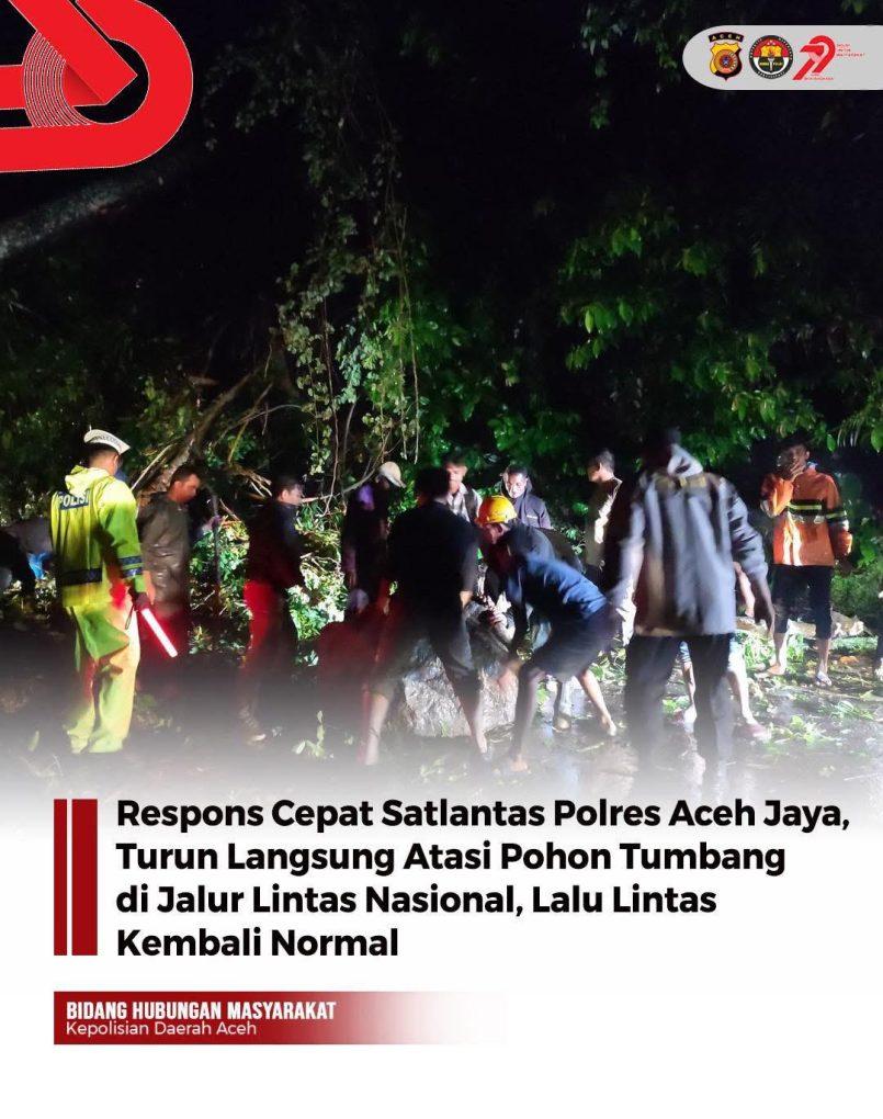 Sebagai bentuk pelayanan prima kepada masyarakat, dua personel dari Satlantas Polres Aceh Jaya bersama satu personel dari Polsek Jaya langsung turun ke lokasi kejadian. Mereka melakukan pengamanan, pengaturan arus lalu lintas, serta pembersihan material pohon tumbang yang menutupi badan jalan guna menghindari kemacetan dan potensi kecelakaan lalu lintas.