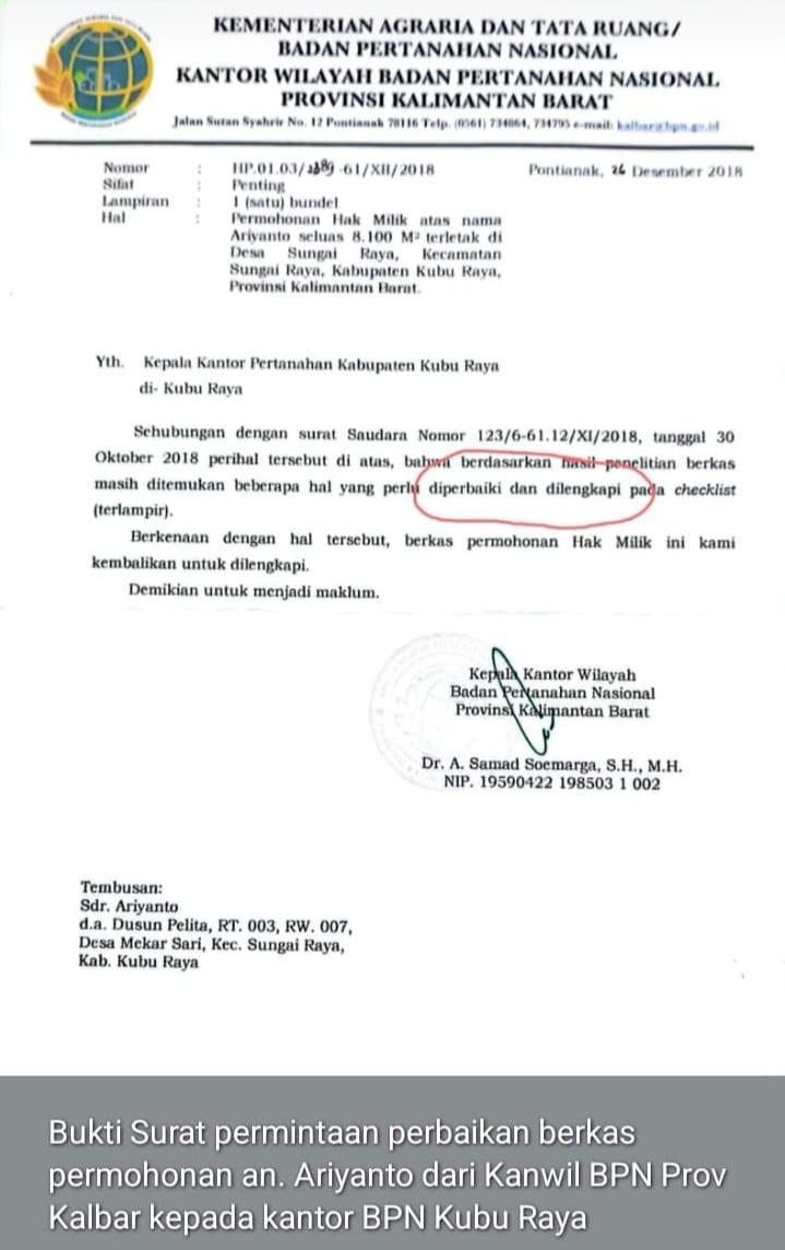 Lebih jauh, surat-surat yang disebut “dipalsukan” oleh Termohon, ternyata menurut penjelasan Pemohon merupakan hasil perbaikan dokumen administrasi berdasarkan arahan resmi dari BPN Kubu Raya, untuk melengkapi permohonan sertifikasi atas nama Ariyanto. Hal ini diperkuat oleh surat dari Kanwil BPN Provinsi Kalimantan Barat Nomor: HP.01.03/238G-61/XII/2018 tanggal 26 Desember 2018, yang memuat permintaan perbaikan berkas permohonan atas nama Ariyanto.