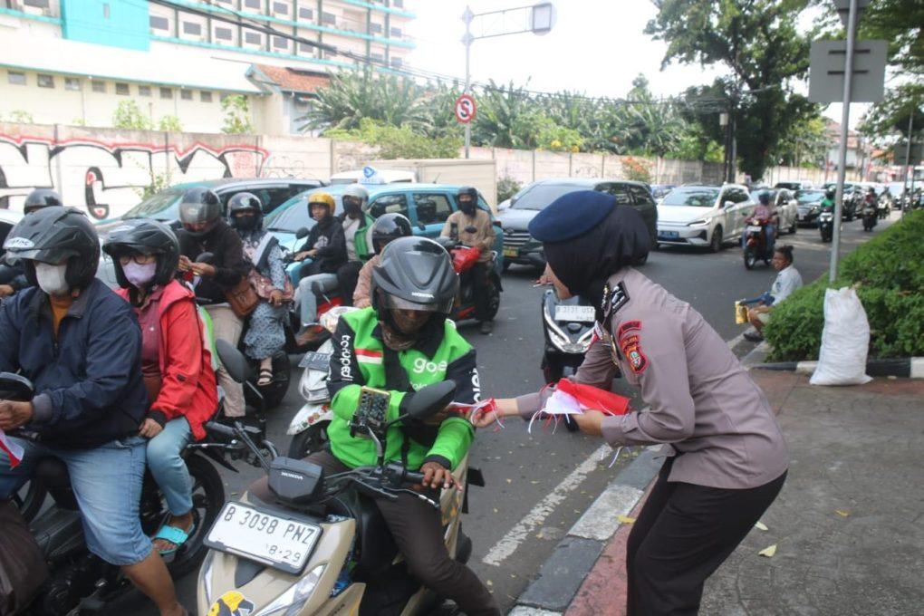 Ribuan pengendara sepeda motor dan mobil yang melintas di lokasi tampak antusias menerima bendera yang dibagikan oleh personel Brimob berpakaian dinas lengkap. Selain itu, petugas juga mengimbau masyarakat untuk turut mengibarkan bendera Merah Putih di rumah, kendaraan, maupun lingkungan kerja selama bulan Agustus.