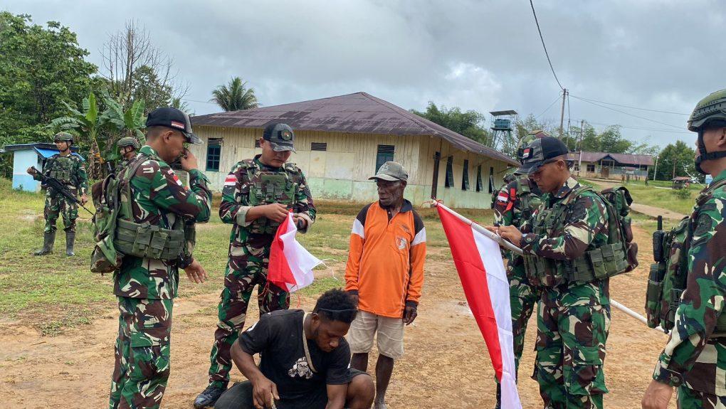 Tak hanya sekadar berbagi, personel Satgas juga turun langsung membantu warga memasang bendera di depan rumah, menghiasi kampung dengan nuansa merah putih yang semarak. Anak-anak pun terlihat antusias menerima bingkisan biskuit dan madu yang dibagikan sambil tersenyum bahagia.