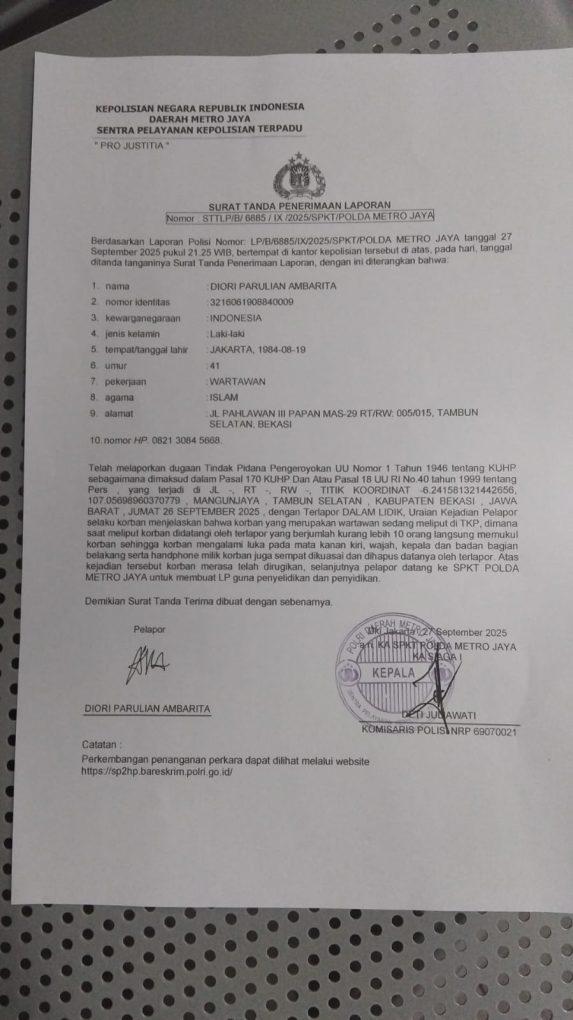 Jakarta, 2 September 2025 — Kasus kekerasan terhadap jurnalis kembali mencoreng kebebasan pers di Indonesia. Seorang wartawan bernama Diori Parulian Ambarita resmi melaporkan dugaan tindak pidana pengeroyokan ke Sentra Pelayanan Kepolisian Terpadu (SPKT) Polda Metro Jaya, usai menjadi korban penganiayaan saat menjalankan tugas jurnalistik.