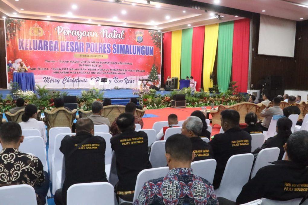 REPORTASE JAKARTAPEMATANGSIANTAR – Kehangatan dan kebersamaan mewarnai perayaan Natal Keluarga Besar Polres Simalungun yang digelar di Aula Universitas HKBP Nommensen, Jalan Sangnawalu, Kelurahan Siopatsuhu, Kecamatan Siantar Timur, Kota Pematangsiantar, pada Sabtu (20/12/2025) sore. Kapolres Simalungun AKBP Marganda Aritonang, SH, SIK, MM., memimpin langsung perayaan dengan tema yang penuh makna: “Allah Hadir Untuk Menyelamatkan Keluarga” dan sub tema “Sukacita Kelahiran Yesus Kristus Memotivasi Polri dalam Melayani Masyarakat untuk Indonesia Maju”.