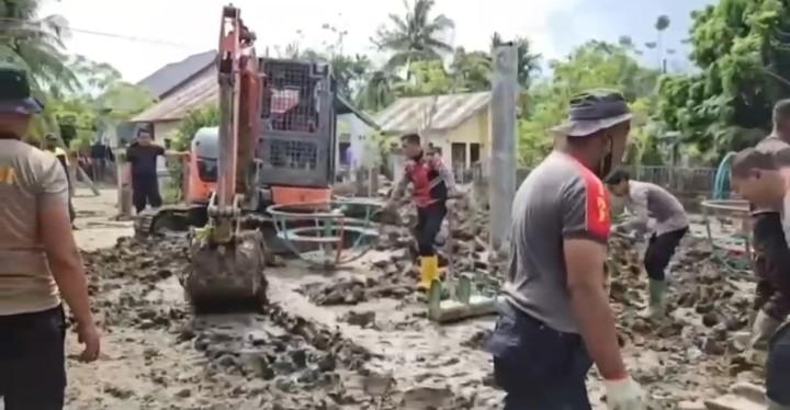 “Polri hadir bersama masyarakat untuk mempercepat pemulihan pascabencana. Gotong royong ini tidak hanya membersihkan lingkungan, tetapi juga menjadi upaya bersama memulihkan aktivitas sosial dan pendidikan warga,” ujar Kombes Pol Erdi. Ia menambahkan, fokus utama pemulihan diarahkan pada fasilitas pendidikan agar dapat segera difungsikan kembali. Hal ini sejalan dengan kebijakan Dinas Pendidikan Provinsi Aceh yang menetapkan dimulainya proses belajar mengajar pada Senin, 5 Januari 2026, bagi sekolah-sekolah yang telah dinyatakan layak digunakan. Pembersihan dilakukan dengan menyasar pengangkatan lumpur, sampah, serta sisa material banjir yang menutupi fasilitas umum, kantor pemerintahan gampong, meunasah, lingkungan permukiman warga, hingga ruang kelas dan halaman sekolah. Seluruh kegiatan berlangsung dengan semangat kebersamaan, kekompakan, dan gotong royong antara personel Polres Pidie Jaya dan masyarakat setempat. Melalui kegiatan ini, Polres Pidie Jaya berharap pemulihan pascabencana dapat berjalan lebih cepat, sehingga aktivitas masyarakat, khususnya kegiatan pendidikan anak-anak, dapat kembali berjalan normal dalam suasana yang aman dan kondusif. (red/LR)