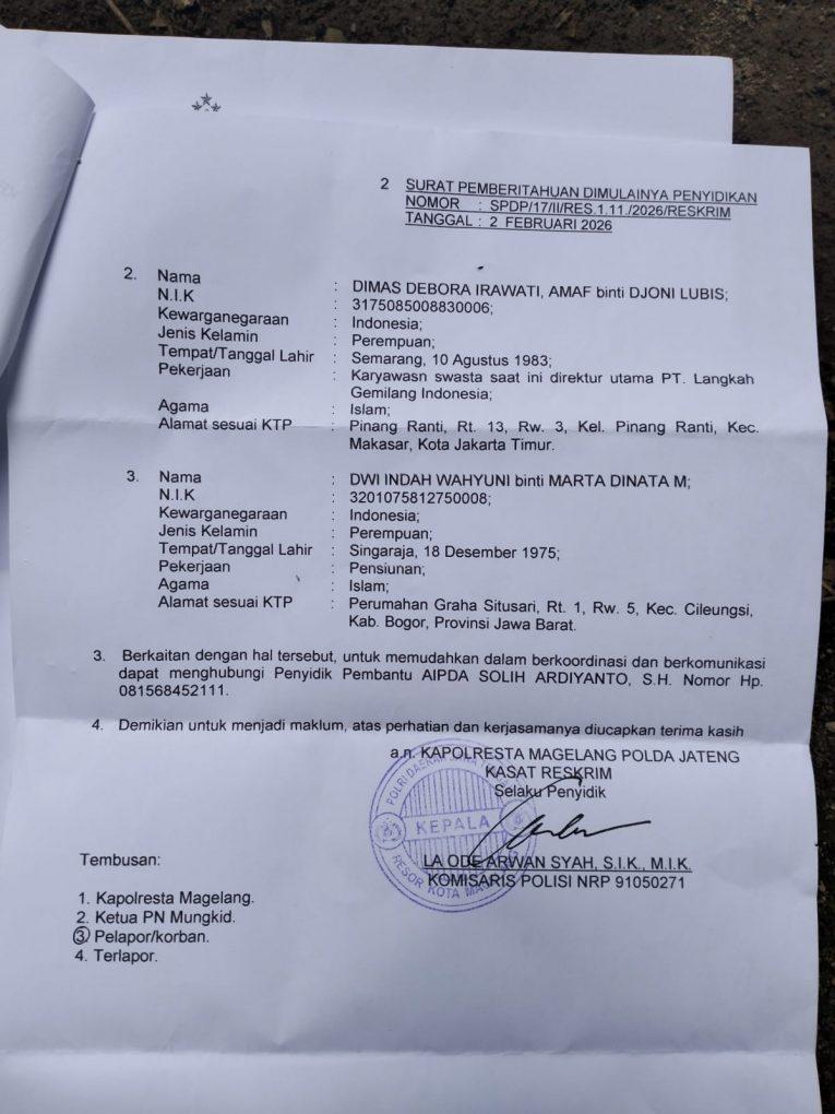 Polresta Magelang Polda Jawa Tengah telah menerima laporan tersebut dan saat ini tengah melakukan penyelidikan untuk mengungkap kasus penipuan ini. “Kami akan mengusut tuntas kasus ini dan memastikan bahwa pelaku penipuan dapat diadili,” kata Kapolresta Magelang, Kasat Reskrim Polresta Magelang