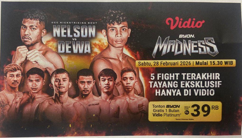• Bonus: Gratis paket Vidio Platinum 1 bulan (S&K berlaku) ⸻ Dengan komposisi laga yang padat rivalitas dan persentase finis tinggi, Byon Madness Vol. 3 diproyeksikan menjadi salah satu panggung paling eksplosif di awal tahun 2026 dalam lanskap combat sports nasional. (Arisyi).