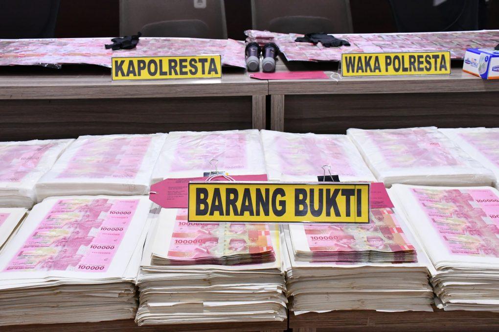 Adapun barang bukti yang diamankan diantaranya 607 Lembar Uang Palsu Pecahan 100 ribuan, 100 Lembar Hasil Cetakan Uang Palsu Yang Belum Dipotong, 52 Rim Kertas Dusla Yang Sudah Mempunyai Watermark, 1 Dus Berisikan Uang Palsu Pecahan 100 ribuan Yang Baru Tercetak Sebelah, laptop, monitor, flashdisk, empat unit printer, Sembilan Gulung Pita Berwarna Emas, Mesin Hologram, Dua Unit Mesin Penghitung Uang, 67 Lembar Pengikat Uang Pecahan 100 ribuan yang terdapat Logo Bank, Alat Sensor Infrared, handphone, dan lainnya
